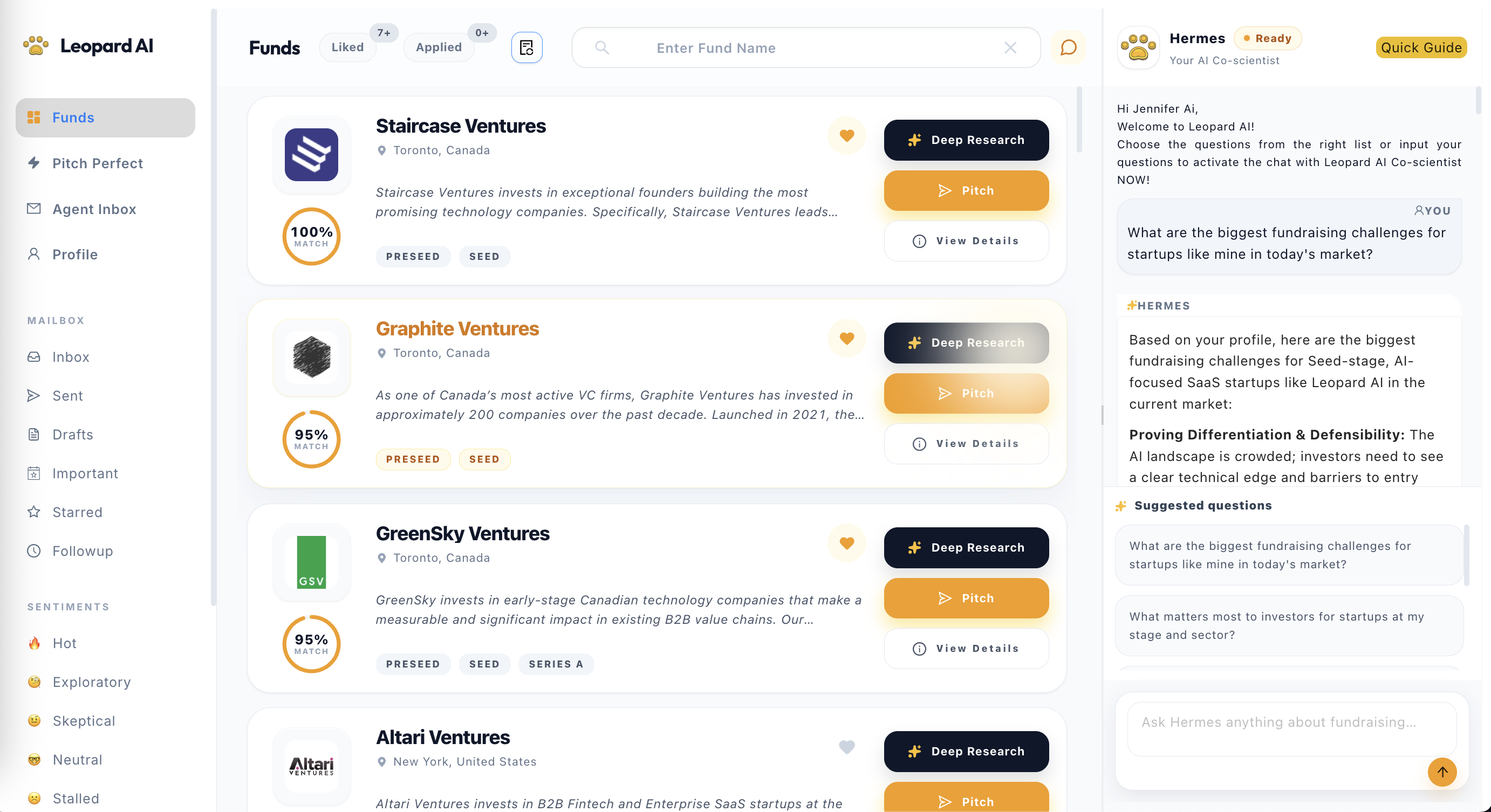 Supercharge your startup’s fundraising success with Leopard AI proprietary copilot - from researching, pitch perfection, to investor's sourcing, matching and outreaching, with real-time market-driven insights and personalized recommendations, saving you hundreds of hours.